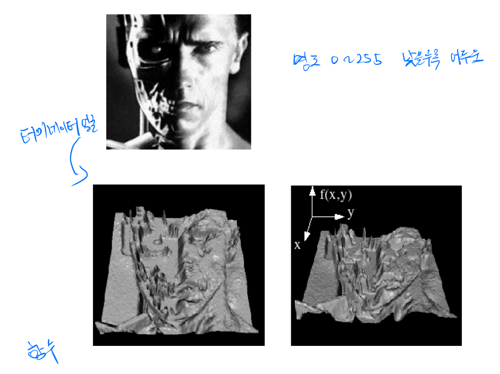 f(x,y)에 좌표값을 넣으면 나오는 명도값이 z축으로 표기 될 것이고 터미네이터의 얼굴이 보인다!