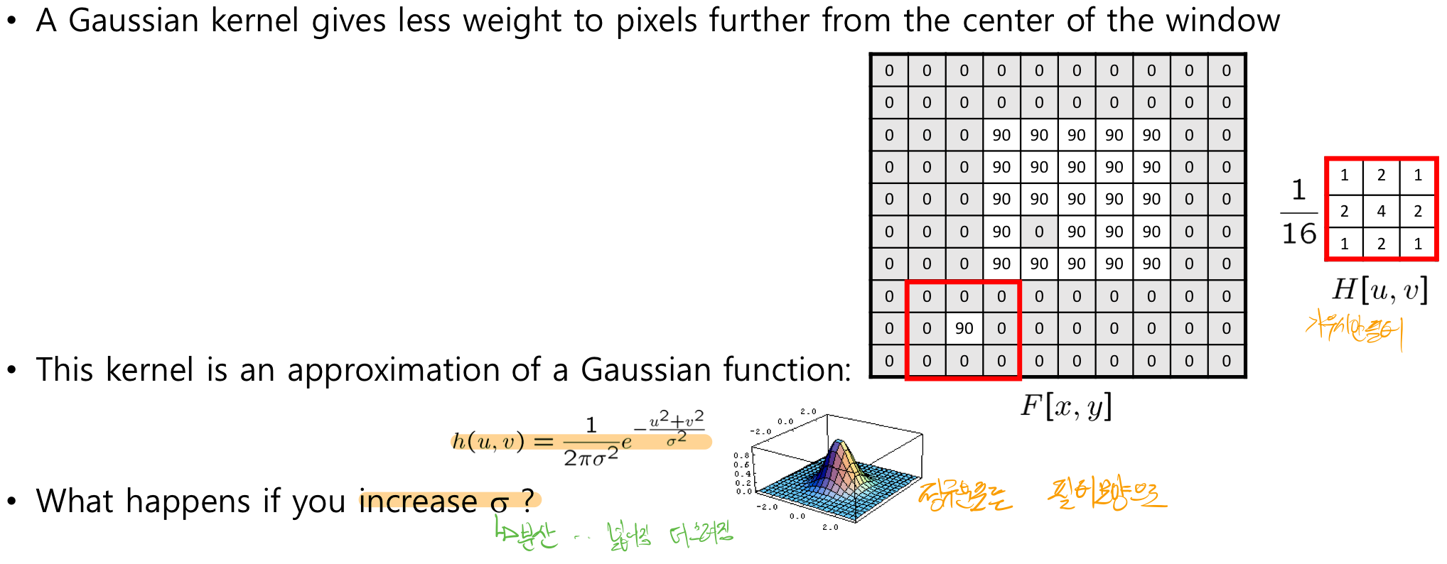 가우시안 필터를 사용하면 블러효과를 낼 수 있다. 정규분포에서의 분산의 값을 이용해 변형한다. 분산의 값이 클 수록 범위가 넓어지기 때문에 더 흐려진다.