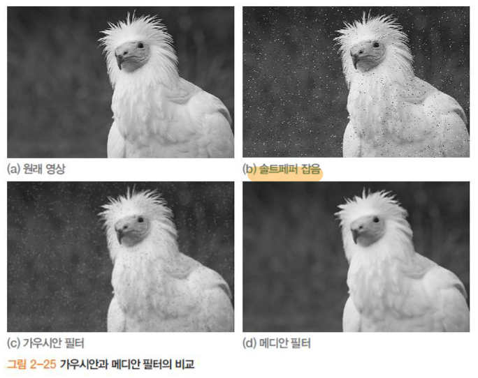 (b)솔트페퍼 잡음이 존재하는 이미지에 메디안 필터가 적용되면 잡음이 사라지는 것을 알 수 있다. 어떻게 가능한걸까?
