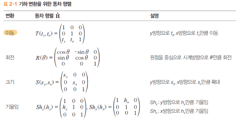 이렇게 만들어진 동차 좌표를 동차행렬연산을 통해 손쉽게 이동, 회전, 크기, 기울임과 같은 연산을 할 수 있다.