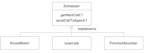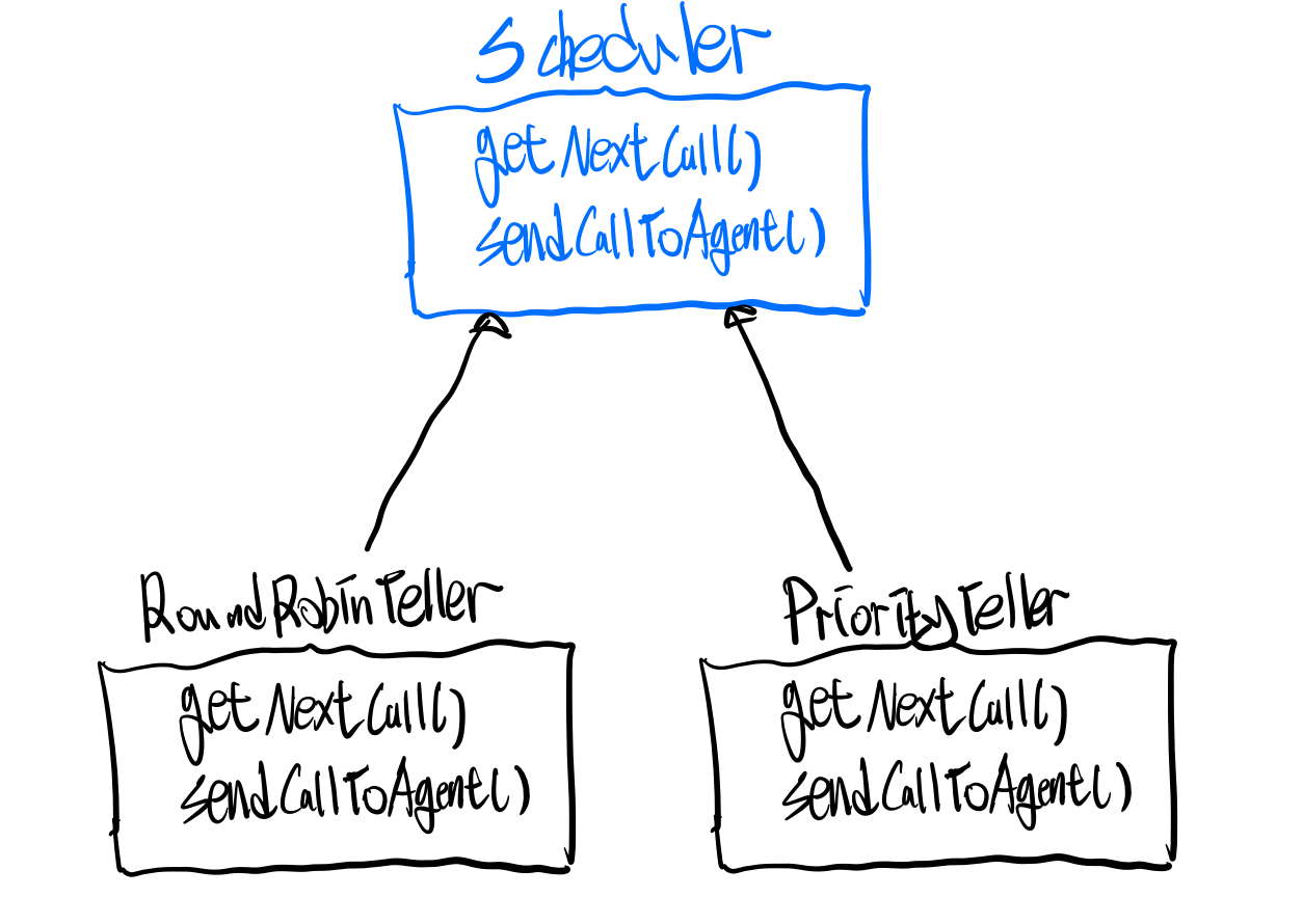 만약 이렇게 전략을 분리시키지 않고, Scheduler자체를 각각의 Teller에게 구현하면 어떤 문제점이 발생하는지 그 다음 예제에서 살펴보자.