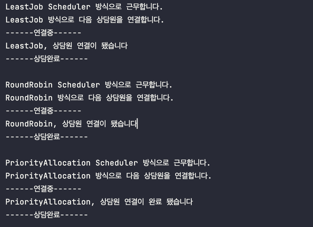 - 이 상담원들에게는 3가지의 근무 방식(스케줄링)이 존재한다. RoundRobin, LeastJob, Priority 방식으로 다음 상담자를 배분할 수 있다.