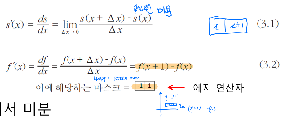 저번시간에는 미분을 통해서 엣지인 지점을 어떻게 찾을 수 있는지, 이를 마스크를 통해서 계산하는 방법에 대해서 배웠다. 배운 내용을 간단히 요약 해보며 시작하겠다.