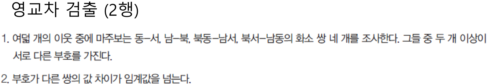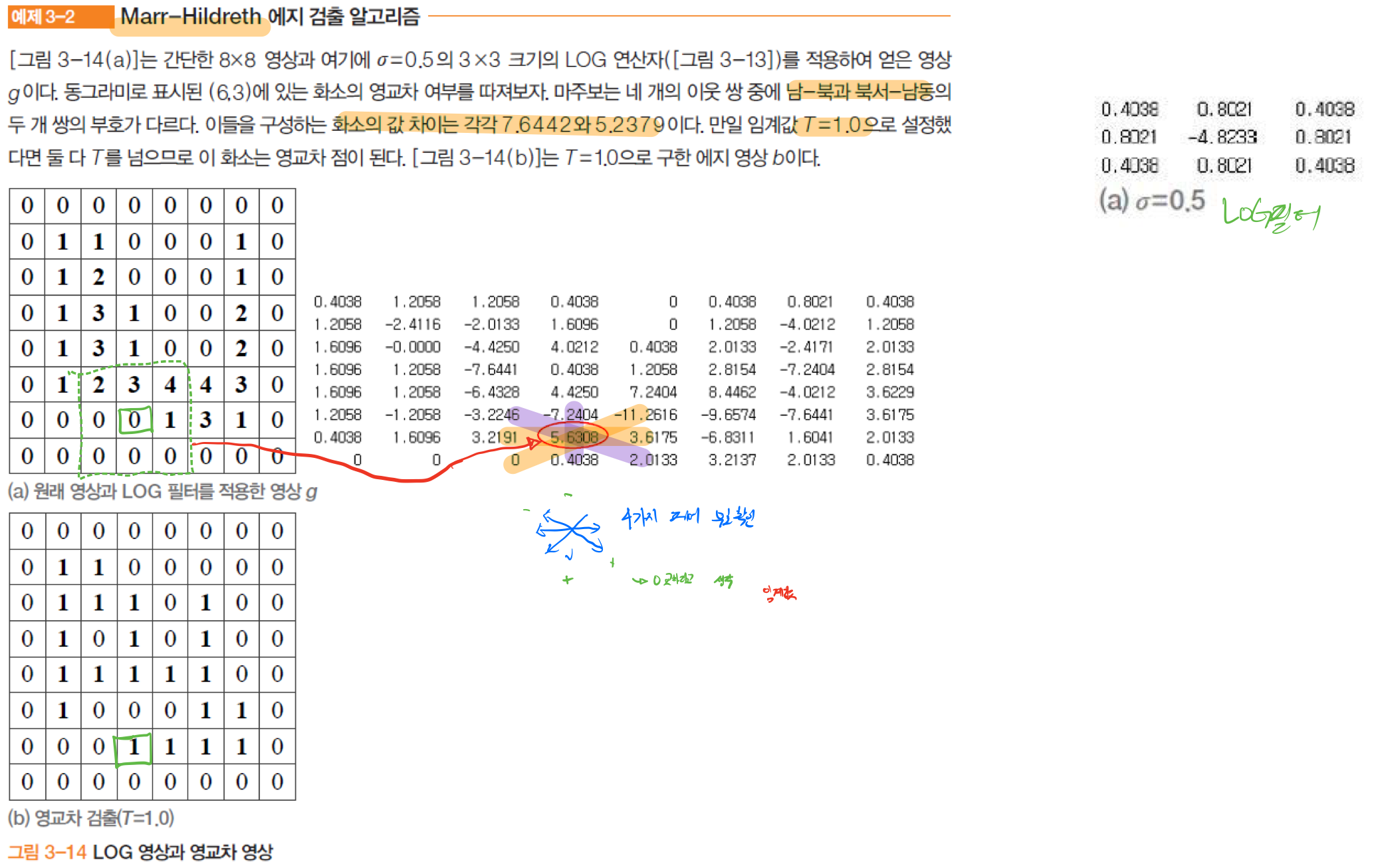 Marr-Hildreth의 검출 방법에 따라서, LOG필터로 구한 값들의 북-남, 동-서, 북서-남동 , 복동-남서의 4가지 부호차를 살펴본다. 북-남, 북서-남동이 부호차이가 생기기때문에 1차 조건을 만족하고, 이 부호가 다른 쌍들의 각각의 차가 임계값(T=1)을 만족하기에 해당 부분을 엣지로 검출할 수 있다. 그래서 (b)영교차 검출된 영상에서 엣지라고 표시를 하게 되는 것이다.