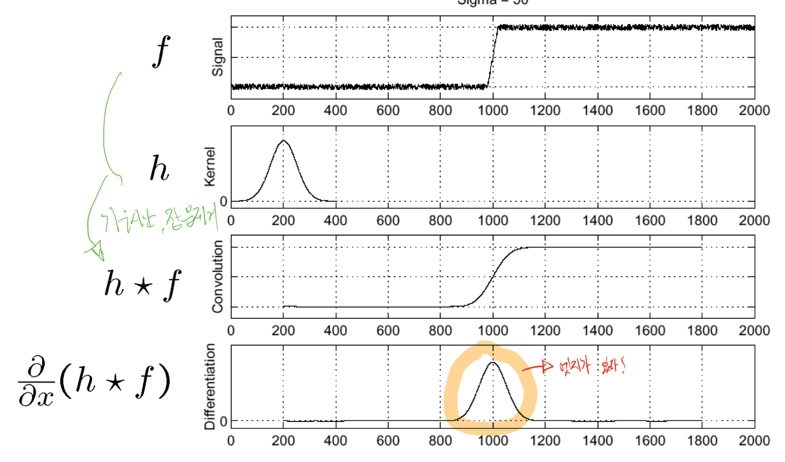 실제 엣지는 파란 부분이지만, 잡음(노이즈) 때문에 미분된 값을 보게되면 엣지를 찾을 수 없다는 것을 알 수 있다.