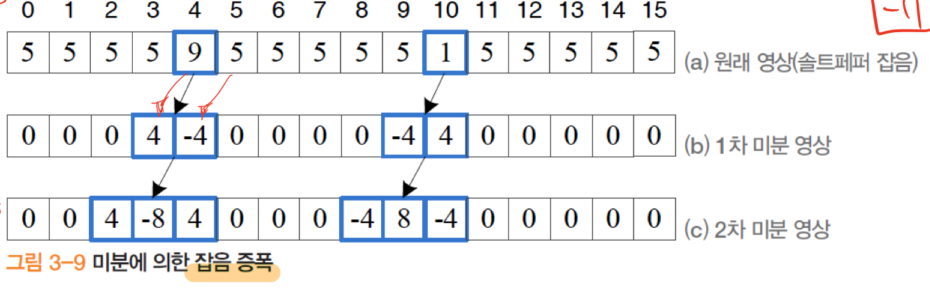 미분은 잡음을 증폭시킨다. 원래영상에 솔트페퍼 잡음(이미지상 9)가 존재한다고 가정해보자.