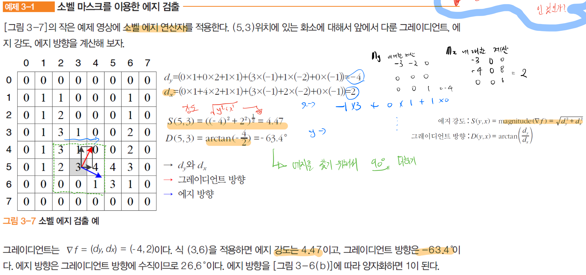 이 편미분 값에 아크탄젠트를 해 그래디언트각도를 얻어내면 -63.4도, 그래디언트 강도 4.47이 된다. 이를 그림에 표시하면 빨간선이 나오게 된다. 여기에 90도를 더하면 엣지의 그레디언트가 될 것이다.