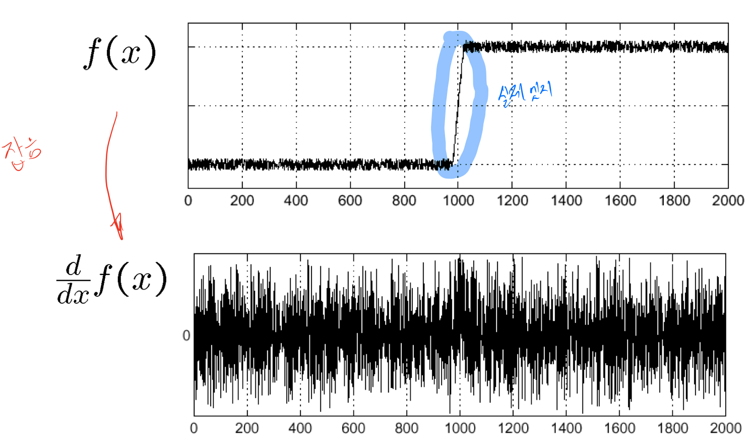 미분을 통해 얻어낸 값은 기울기가 증가, 감소하는지 알 수 있다. 그 증가 감소는 결국 양 옆을 보면서 알 수 있는데, 잡음이 있는 상태로 미분을 하게 되면 양옆을 비교하는 탓에 점점 증폭됨을 알 수 있다.