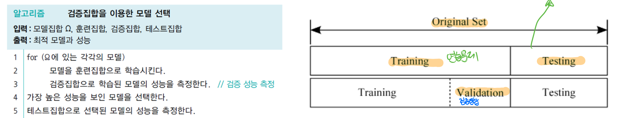 교수님께서 강조하신 말씀은 Testing data set은 절대 손대지 말라고 하셨다. 그렇기 때문에 Training데이터 내에서 Validation 데이터로 한단계 더 나누도록 한다. 각각의 모델을 Training(훈련)집합으로 학습시킨 후, Validation으로 성능을 측정하고, 모든 모델들의 성능측정중 가장 높은 성능을 보인 모델을 선택하여 최종적으로 Testing집합으로 성능을 측정하는 방법이다.
