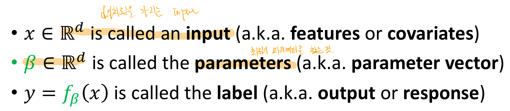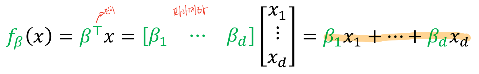입력값 x는 한개만 존재하는 것이 아닌 R^d 즉 d는 차원으로써 3차원 4차원 등등 여러개의 값을 가질 수 있다. 이를 벡터로 표현할 수 있다.