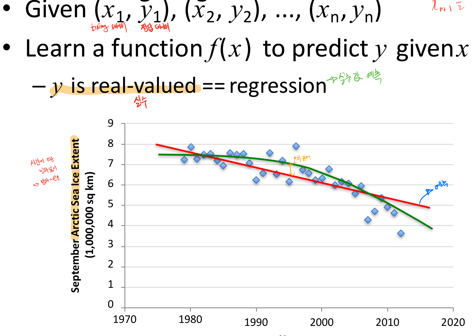 시간에 따른 빙하의 면적에 관한 데이터이다. 입력값 x는 현재 하나이다. 어느정도 빨간색의 회귀선을 그려 예측이 가능하다.