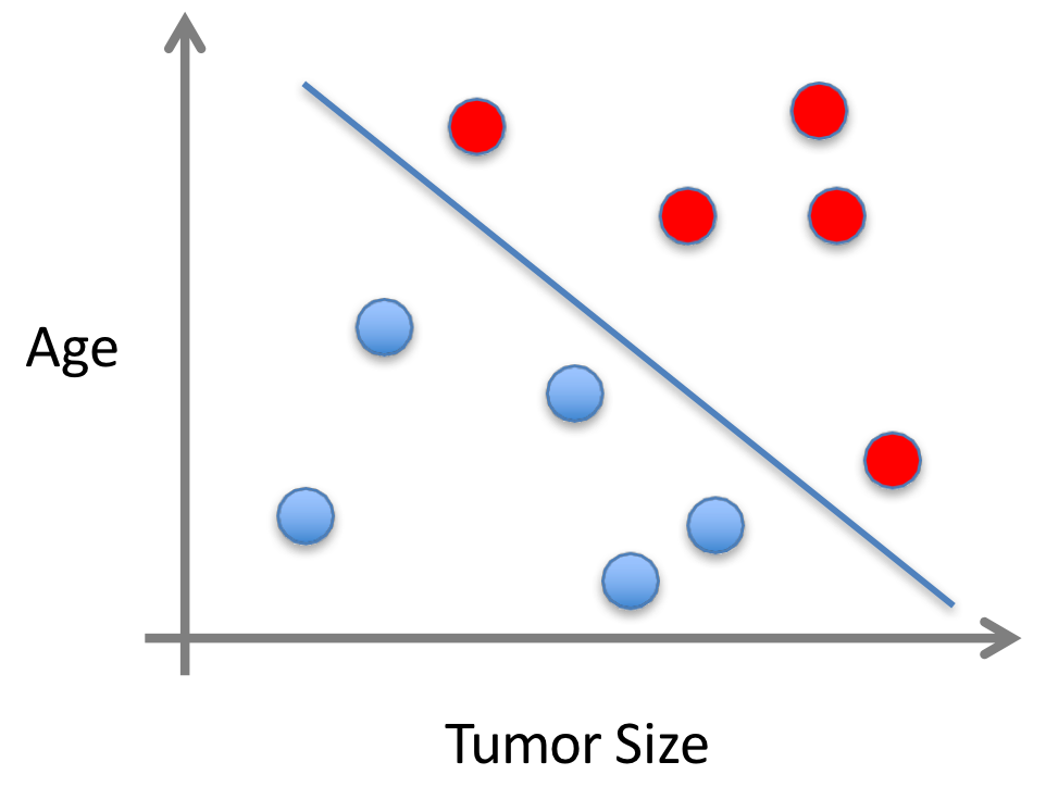 그러나 이러한 1차원적인 데이터로는 오차가 발생하기 때문에, 입력값을 mulit-dimensional하게 즉 여러개(여러차원)으로 확장 시킬 수 있다. 종양의 크기와 Age(나이)의 데이터가 있다면 더욱 쉽게 분류 할 수 있을 것이다.
