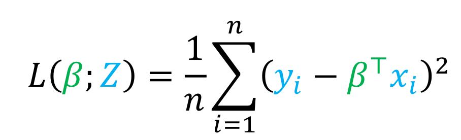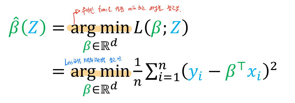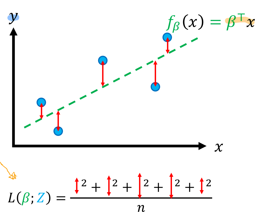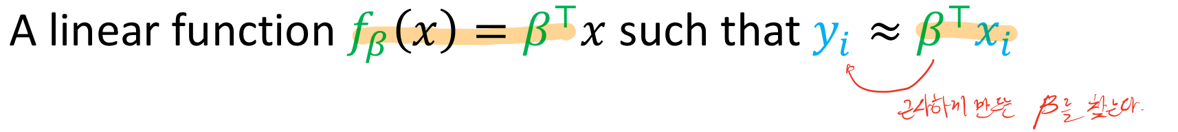 파라메타(베타)를 전치시키고 곱해주면 함수의 꼴로 표현 할 수 있다. 이러한 파라메타를 찾는 것이 목표이다. 파라메타를 표현하는 베타는 사람마다 다르게 표현 할 수 있기 때문에 베타라고 한정되어 암기하고 있지 말고 유동적이게 읽을 수 있는 능력이 필요하다 했다.