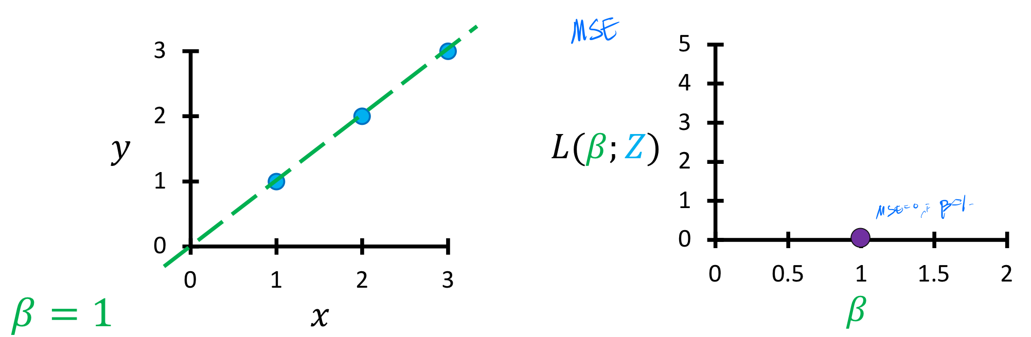 y = 1x, 즉 베타가 1일때 왼쪽의 그래프와 같이 그려질 것이며, 손실함수를 좌표에 표시하면 오른쪽과 같다. 손실함수가 0이라는 뜻은 딱 들어 맞는 완벽한 것이라는 뜻일 것이다.