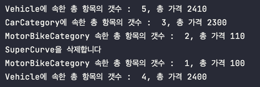 System.out.println("MotorBikeCategory 속한 총 항목의 갯수 : " + MotorBikeCategory.getCount() + ", 총 가격 " + MotorBikeCategory.getPrice());