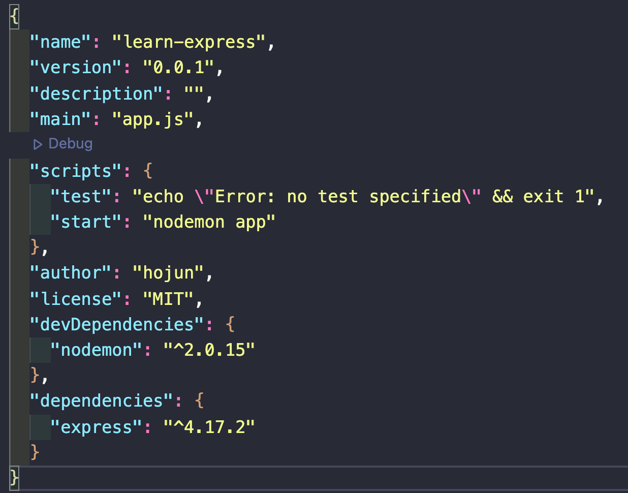 dependencies는 설치한 모듈들이다. 모듈에 대한 버전 정보가 들어있다. 이제 나중에 npm install을 하게 되면 package.json의 디펜던시의 정보를 토대로 모듈들을 설치해 준다.