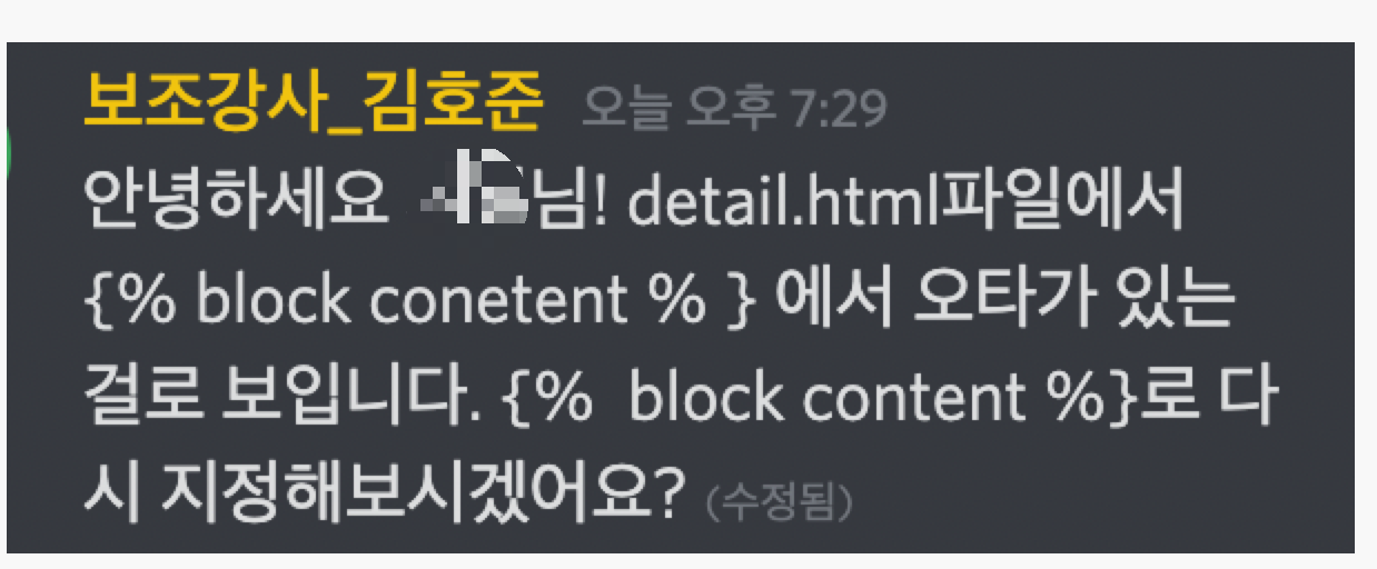 코딩을 처음 접하시는 분들이 대다수였기 때문에 초기에는 이렇게 오타가나서 에러가 나는 경우가 간혹 있었다. 그럴땐 코드를 정말 하나하나 살펴가면서 오타를 찾기도 했다. 이 오타가 진짜 유심히 안보면 그 부분을 보고있어도 오타인지 모른다.. 그리고 코딩이 처음이신분들에게 정말 베이스가 되는 개념을 설명해드리는것도 어려웠다. 마치 1+1가 2인이유를 설명하는 것처럼 말이다.