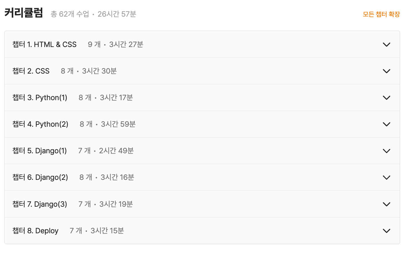 온라인 강의는 아래와 같이 이루어져 있다. 질문에 답하려면 강의내용을 숙지해야하기 때문에 초스피드로 들었다. 장고를 이전에 현장실습(인턴)을 하면서 간단하게 써봤기 때문에 큰 거부감은 없었고, 이왕 이렇게 된거 장고도 공부해보자라는 마인드로 DRF도 공부하면서 블로그에 포스팅도 몇개 했다.