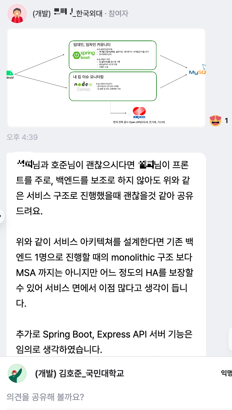 안드개발자가 나름 품귀현상이 일어났고 [클라3 백1 디자인1]이 가장 이상적이었지만 [클라2 백2 디자인1]로 팀 매칭을 마감해야 했다. 다행이도 백엔드 한분이 안드로이드를 경험해보셔서 풀스택을 자원하셨다. 대신 백엔드 두분의 기술스택이 달랐다. 스프링,익스프레스였는데 개발 시작도전에 이 문제를 해결하고자 백엔드 구조를 설계해주셨다.