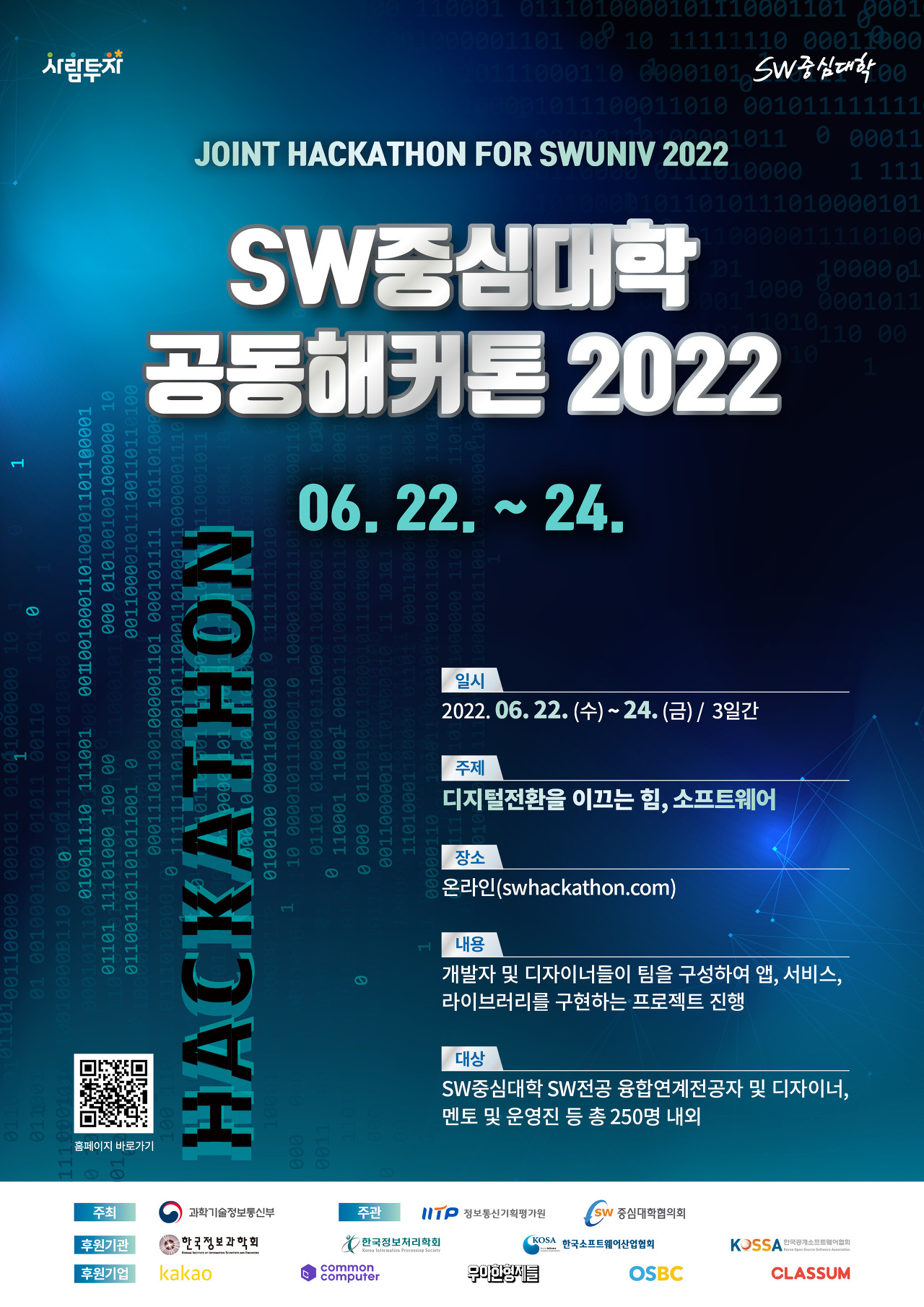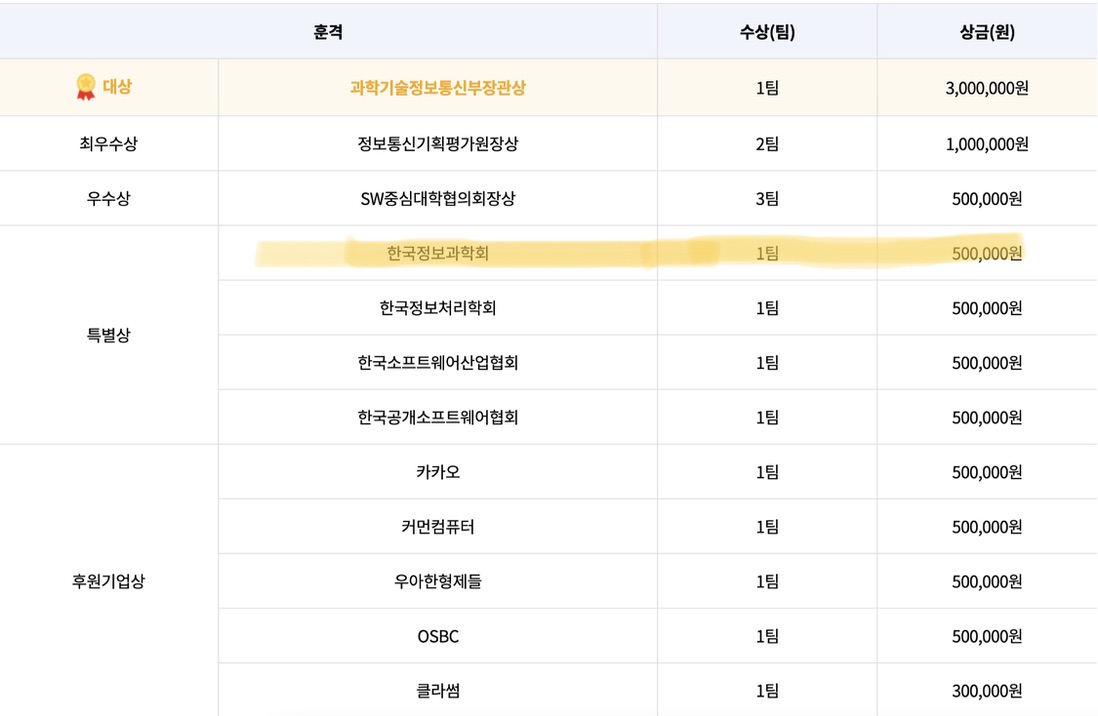 SW중심대학으로 선정된 42개의 대학에서 각각 4명의개발자+1명의디자이너 총 5명이 학교대표로 추천받아 대회에 나갈 수 있다. 대회에 나가서는 같은 대학교학우들끼리는 팀원디 될 수 없다(개발/디자이너는 무관) 즉 생판 모르는 사람들과 3일동안 개발을 해야한다. 카카오, 우아한형제들(배민)과 같은 개발자들 선망의 기업들이 후원한다. 이것부터 그냥 의욕이 쏟아 오
