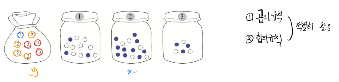 그림과 같이 주머니 한개와, 3개의 병이 있다고 생각해보자. 우린 주머니에서 뽑아 나온 숫자에 해당하는 병에서 공을 뽑을 것이다. 병에는 하얀공과 파랑공 두가지가 있다. 조건부 확률에대해서 공부하기전에 합의규칙을 잠깐 되새겨보자. 주머니에서의 확률변수를 y, 병에서의 확률변수를 x라하고 각각의 정의역은 y = { 1, 2, 3 } , x = { 파랑, 하얀} 이 된다.