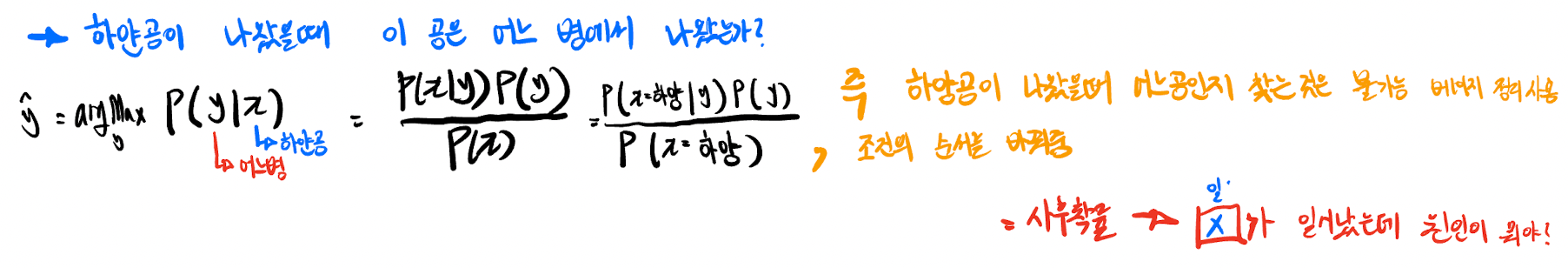 일반적으로 하얀공이 나왔을때 이공은 어디(주머니)에서 나왔는가에 대한 직접적인 추론은 불가능하다. 왜냐하면 주머니에서 먼저 공을 뽑고 이를 통해서 하얀공을 뽑기 때문이다. 베이지정리를 이용함으로써 이러한 추론이 가능하다.