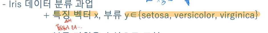 IRIS데이터에는 4가지의 특징 데이터가 있었다. x = { 꽃받침의 길이, 꽃받침의 너비, 꽃잎의 길이, 꽃잎의 너비 } 이 특징벡터에 대한 결과로는 y = { setosa, versicolor, virginica } 이라고 맵핑된다. 즉 우리가 어떤 꽃의 특징벡터(x)를 토대로 이것은 어느 IRIS인지를 찾아 내야 했다.
