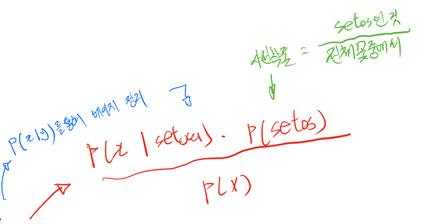 이러한 P( setosa | x )일때의 확률을 구하기 위해서 베이지정리를 활용해 식을 바꾸어 본다면, 아래와 같다.