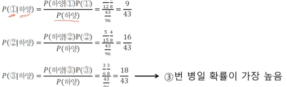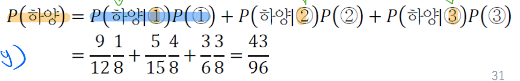 하얀 공이 뽑힐 확률은 어떻게 될까, P( y, x= 하양)인 경우이다. 하양공이 뽑힐 모든 결합확률은 아래와 같이 3가지 일 것이다.