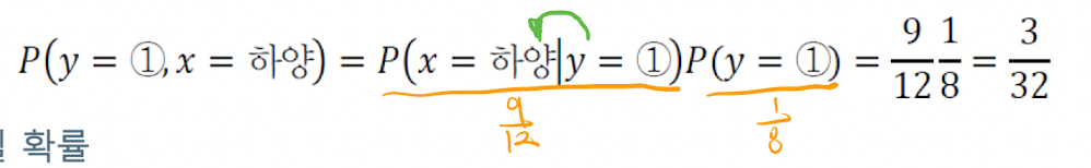 P(y=1, x=하얀) == P(1,하얀)일 확률을 구해보자. 이 사건은 서로 종속인 사건이기때문에 계산에 유의해야한다. 조건부 확률 공식에 의하면 P(A n B) = P(B | A) * P(A)의 형태로 나타내졌다. 이를 통해서 해당 결합확률은, (1번이뽑혔을때하얀공이 뽑힐 확률) * (1번이 뽑힐확률)의 꼴로 나타 낼 수 있다.