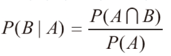 어떤 사건 A가 일어났다는 조건하에 다른 사건 B가 일어나는 확률이다. 예를 들어, 주머니에서 1번공이 나왔을때 파랑공이 나올 확률과 같이 조건이 붙는다.