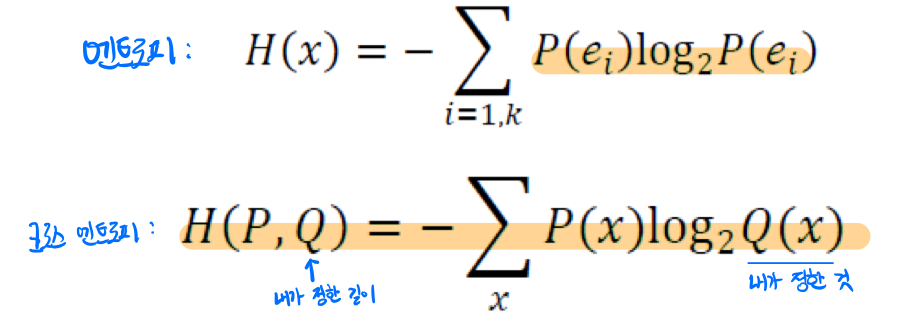 두 확률 분포 P와 Q 사이의 엔트로피를 나타낸다. 여기서 Q에 우리가 생각한 정보량을 넣어본다고 생각하면 된다.