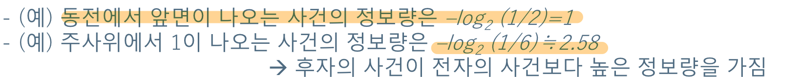 동전의 1/2사건과 주사위의 1/6사건 중 주사위의 사건이 더 확률이 작기 때문에 높은 정보량을 가진다.