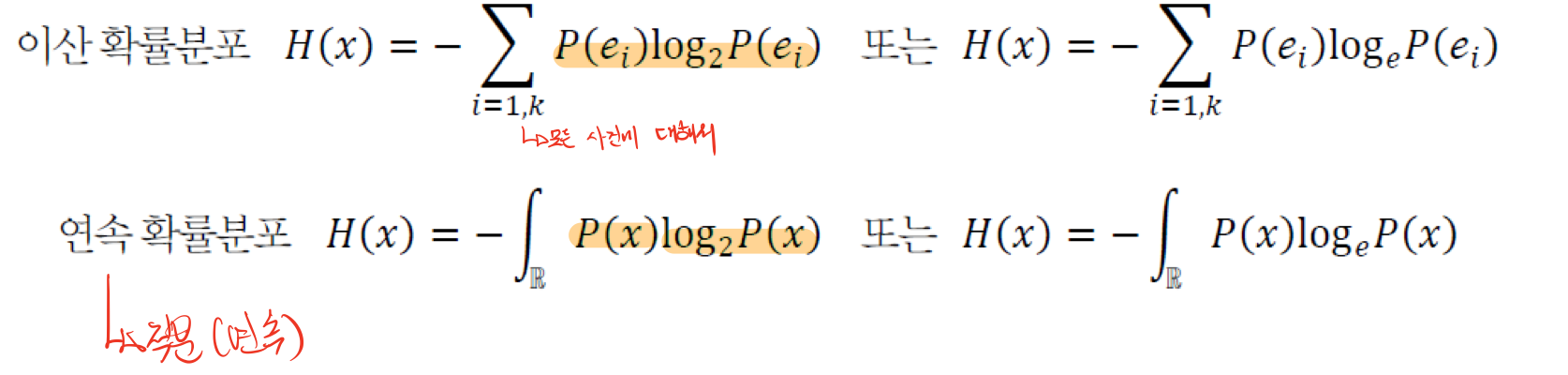 다시 말해 어떠한 한 사건에 대해서 표현하면 위와 같다. 로그의 밑이 2인 경우는 bit를 자연 상수인 경우는 나츠(nat)를 표현한다고 한다.