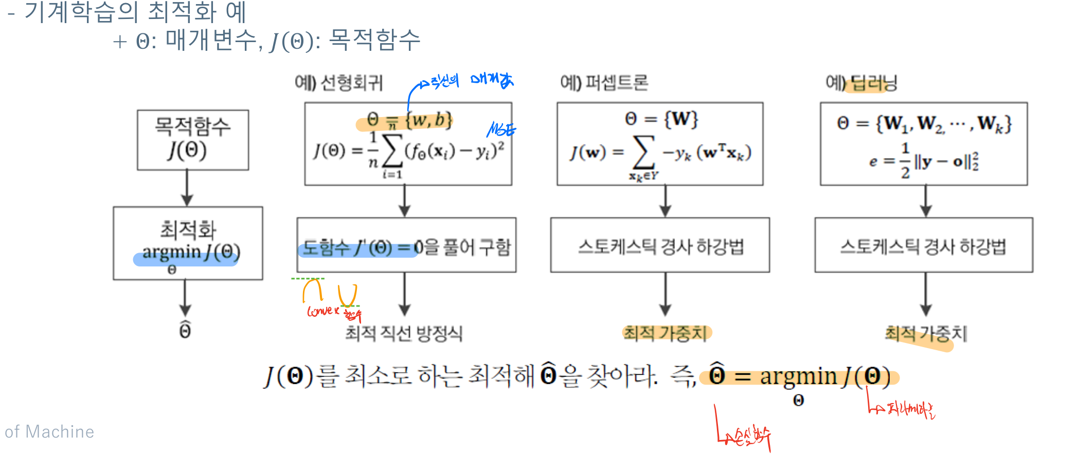 기계학습에서 최적화 : 학습 모델의 매개변수 공간을 탐색하여 목점함수가 최저가 되는 최적점을 찾음.