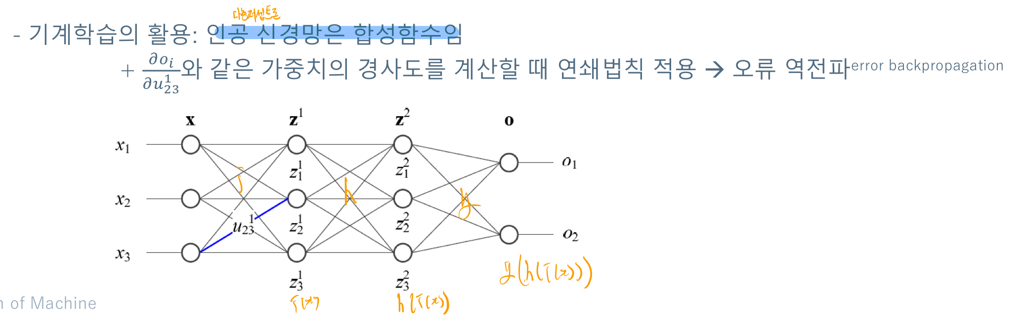 인공 신경망은 결국 합성함수이다. 이번강의에서는 이러한게 있다는 정도만 알려주셨다. 이러한 합성함수의 미분과정을 통해서 무엇인가를 찾게 되는데, 합성함수의 미분이 사용된다고 한다.