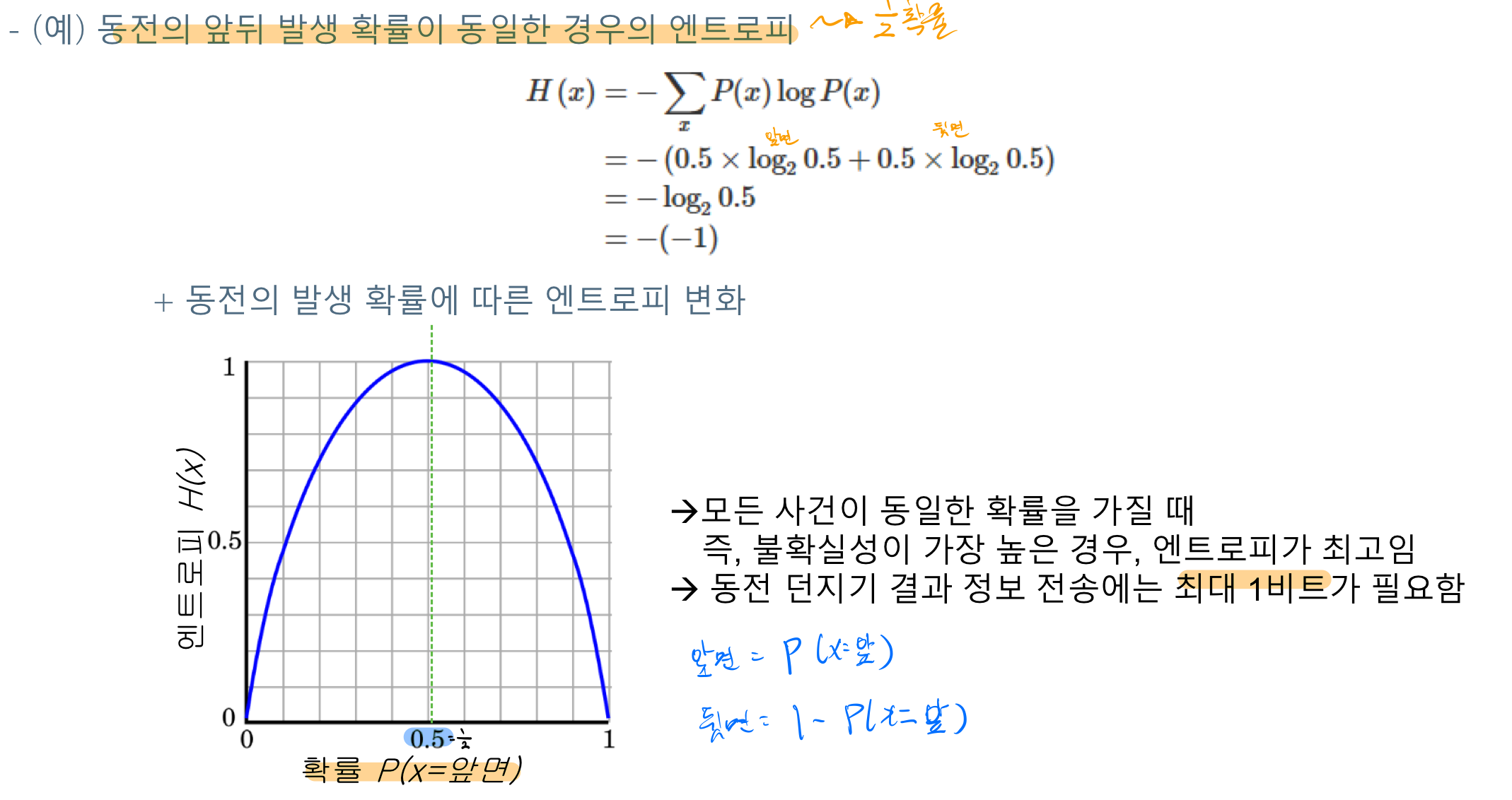 동전 앞뒤 발생 확률(1/2)일 경우의 엔트로피를 봐보자.