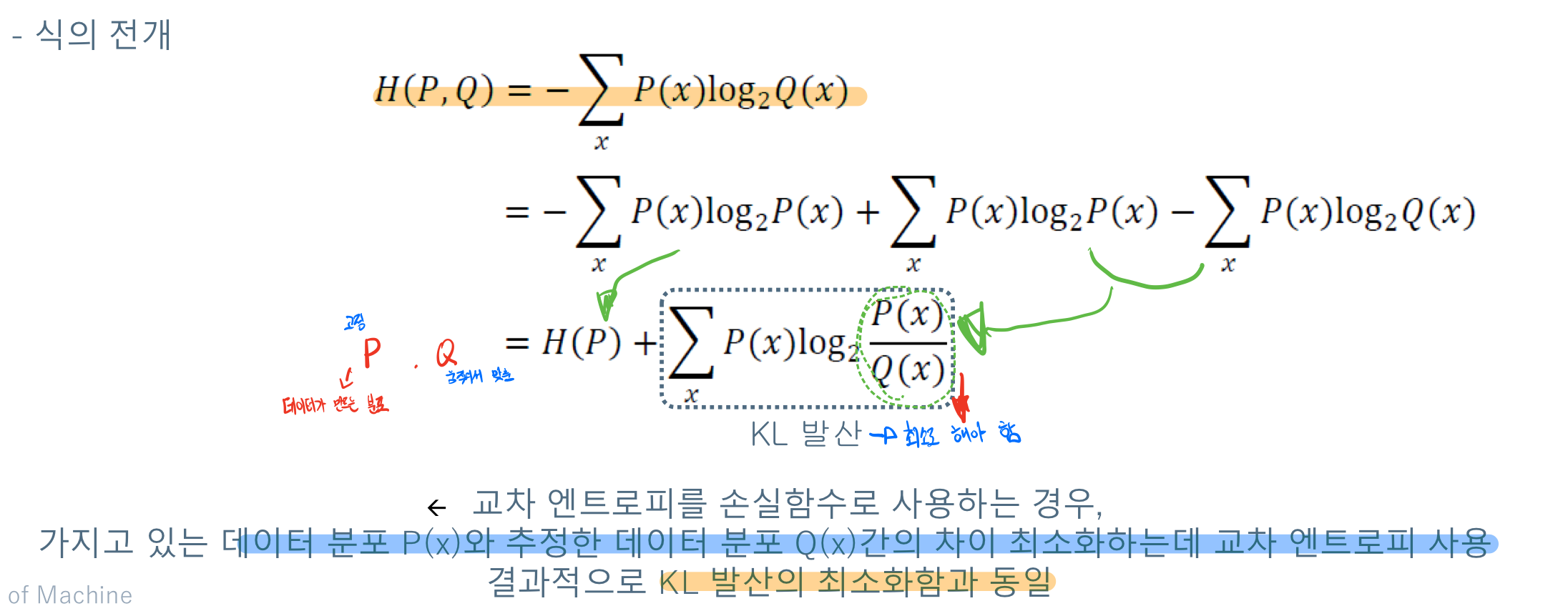 즉 크로스 엔트로피를 손실함수로 사용하는 경우에는 원래 데이터 분포 P(x)와 우리가 추정한 데이터 분포 Q(x)간의 차이를 최소하하는 다시 말해 KL-Divergence를 최소화함과 동일하다는 결론에 달할 수 있다.