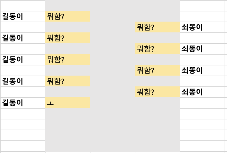 길동이와 쇠똥이의 대화를 살펴보자. 이 대화에서 "뭐함?"이라는 말이 가장 많이 쓰인다. 길동이는 쇠똥이와의 대화가 신물이 났는지 마지막에 회심의 "ㅗ"을 날리고 대화를 종료 했다. 우린 111 또는 0으로 이 대화를 표현해야한다고 치자.