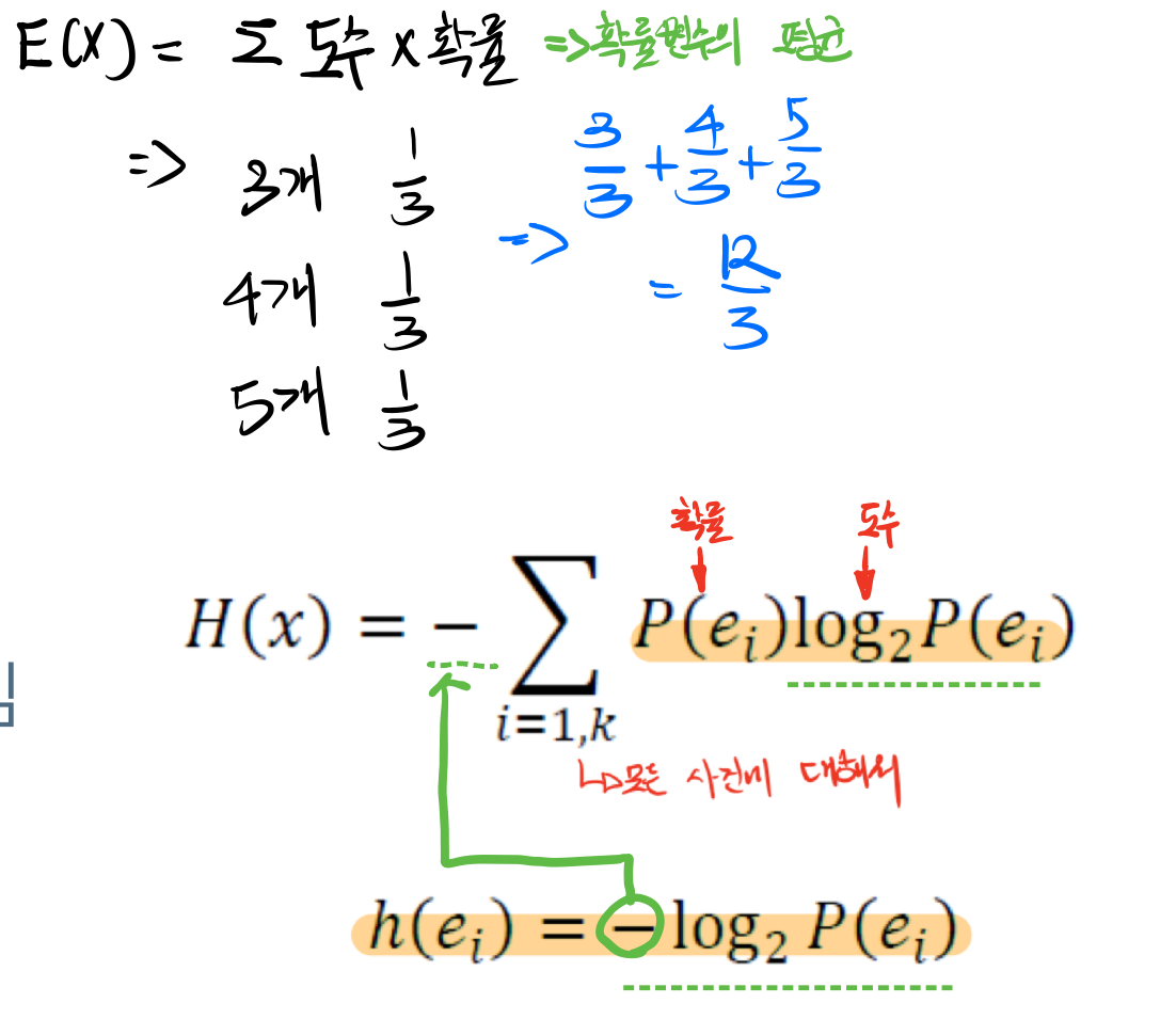 엔트로피는 전체 사건 정보량의 기대값이다. 우리는 확률변수의 기대값(평균)을 도수*확률의 합을 통해서 구했다. 이와 같이, H(x) 또한 비슷한 방법으로 구할 수 있다.
