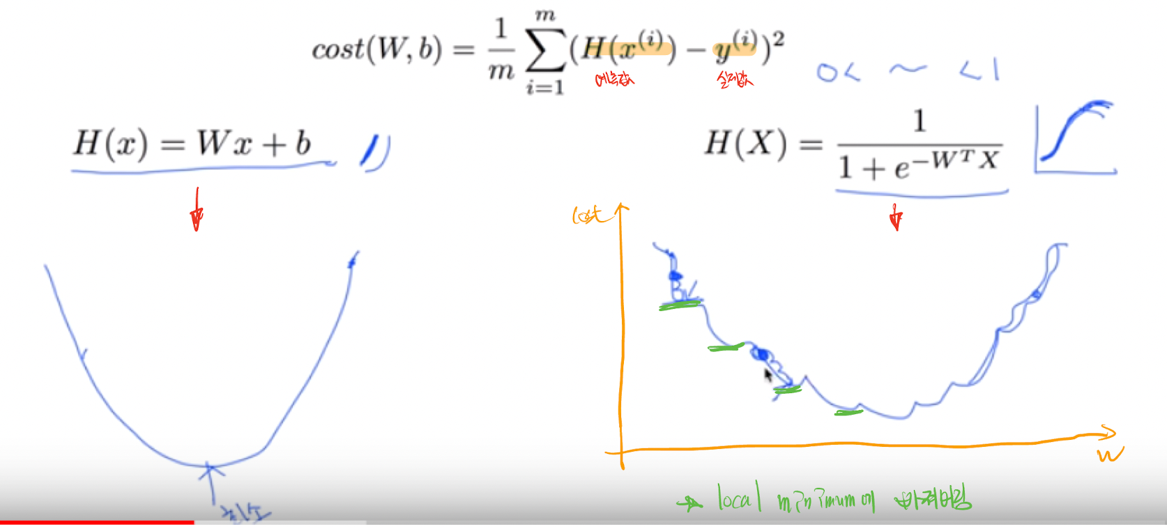 그러나 이렇게 얻은 Logistic funcion에 기존에 있던 손실함수를 사용하게 되면 global minimum을 구할 수 없게 된다. 손실함수가 convex형태가 아니기에 local minimum에 빠지게 되기 때문이다. 그렇다면 바뀐 가설에 맞게 Cost Function도 재설계 할 수 있어야 한다.