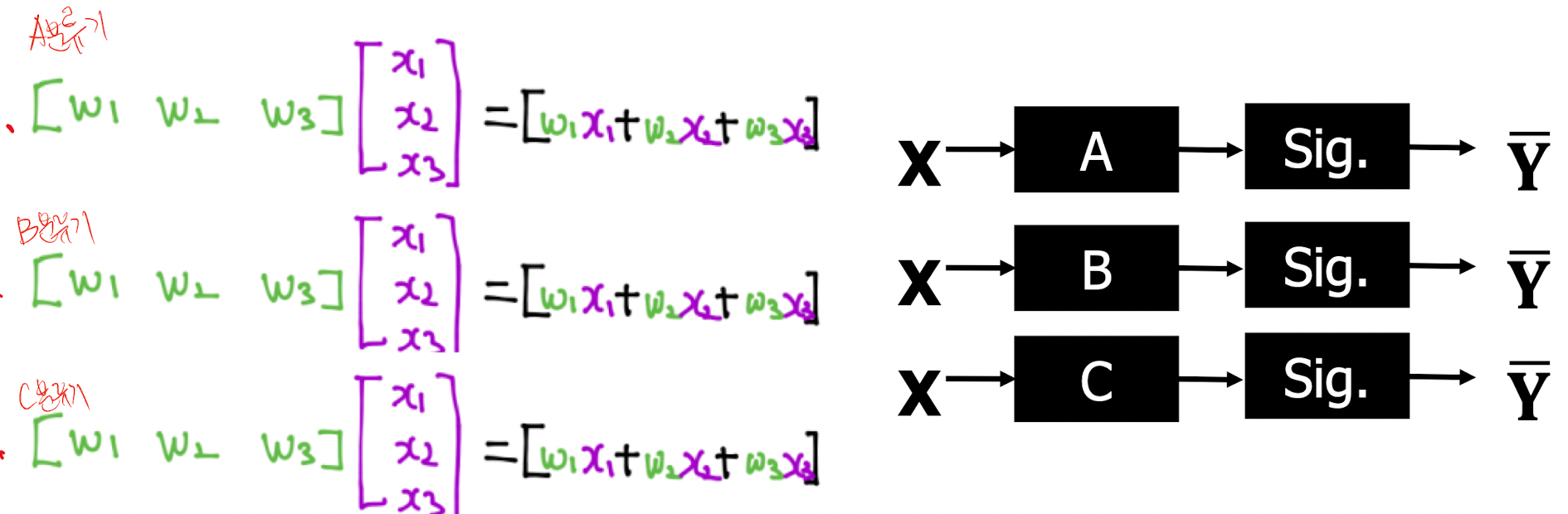 Multi-calss classificaiton은 binary classification을 사용해서 해결 할 수 있다. binary classification는 A / B 로 나눴던 분류방식을 A / not A이와 같이 생각하면 된다. 즉 우리가 A, B, C 세가지를 분류해야 한다면, 3번의 binary classification을 거치면 된다. 3번의 질문을 통해서 해결 할 수 있을 것이다. C를 찾아야 한다면 C에 대해서 A를 판정하는 질문을 던지면 A / or not , B / or not , C / or not이라는 세 질문에 대해서 or not, or not C라는 대답을 통해서 C임을 알 수 있을 것이다.