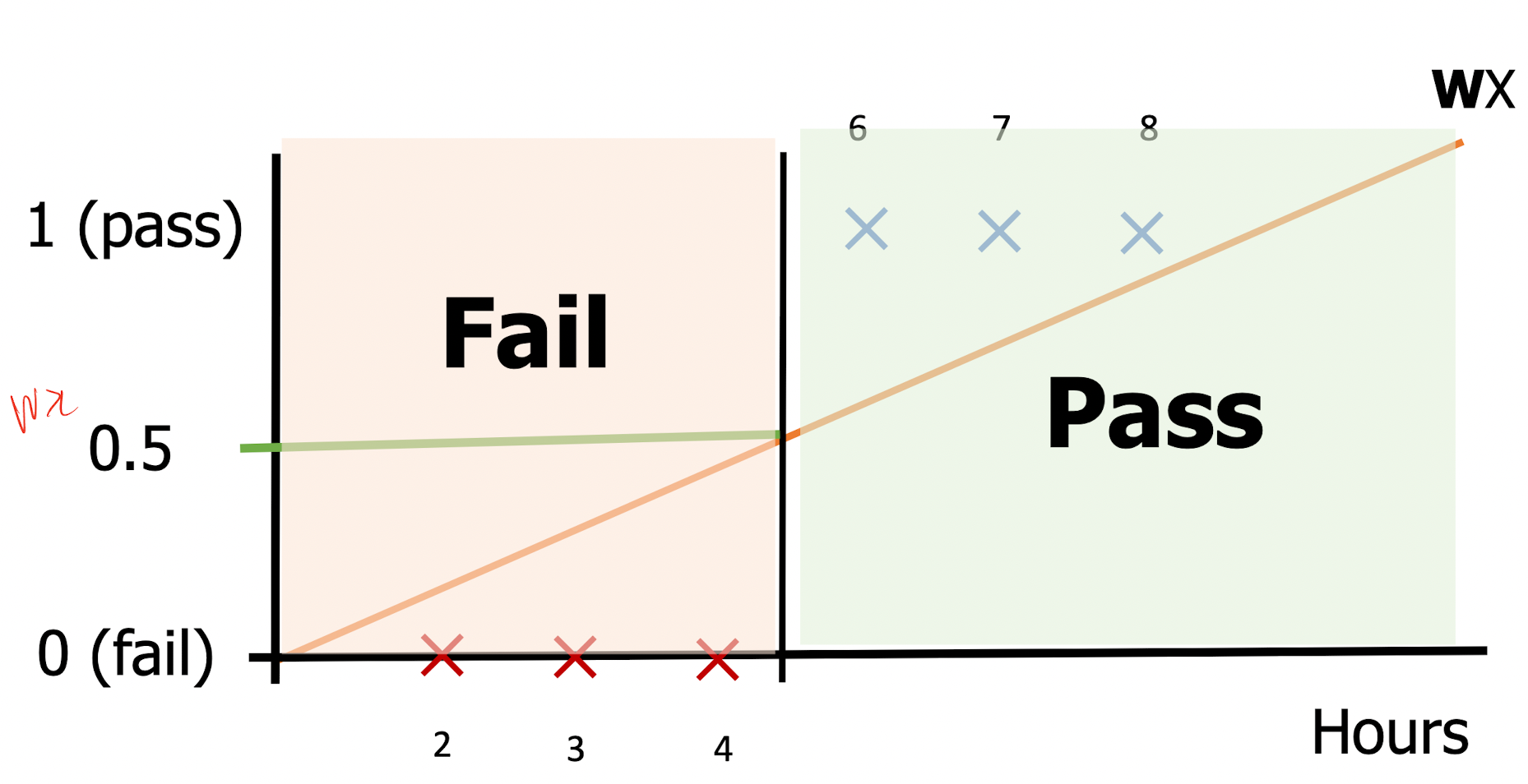 현재 데이터를 기준으로 선형회귀를 시키면 그림과 같은 Wx가 표현될 것이다. 0.5의 기준치를 토대로 pass/fail이 구별되고 있다.