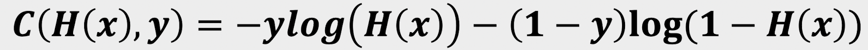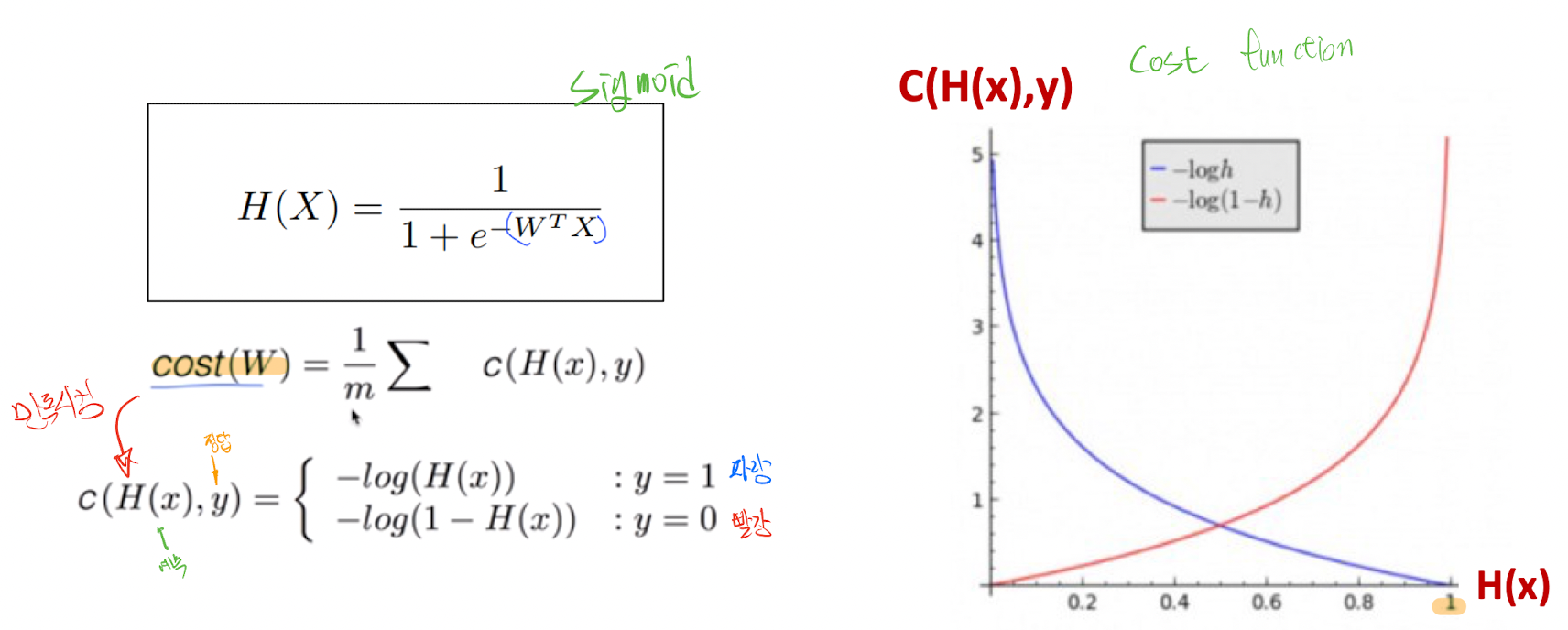 맞춰야하는 정답값이 y=1인경우는 파란색함수(-logh), 정답값이 y=0인경우에는 빨간함수(-log(1-h)를 따르게 된다. 우리가 맞춰야하는 값이 y=1인경우, H(x)가1이라면 손실함수의 값은 0이 된다. 반대의 경우 맞춰야하는 값이 y=1인경우, H(x)의 값이 0이라면 손실함수는 무한대에 수렴한다. 즉 맞췄다면 손실함수가 작고 틀렸다면 커지는 손실함수의 경향성에 만족함을 알 수 있다.