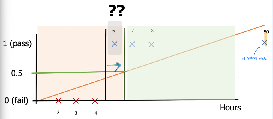 Linear Regression의 값은 이 50이라는 값의 매우 bias하게 된다. 우리가 기존의 0.5로 잡았던 임계점을 토대로 다시 값을 본다면 6시간 데이터는 fail이라는 예측이 나와버린다. 뭔가 대단히 잘못됐다는 것을 느낀다.