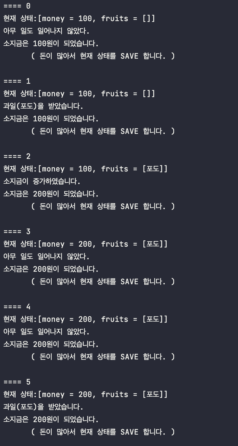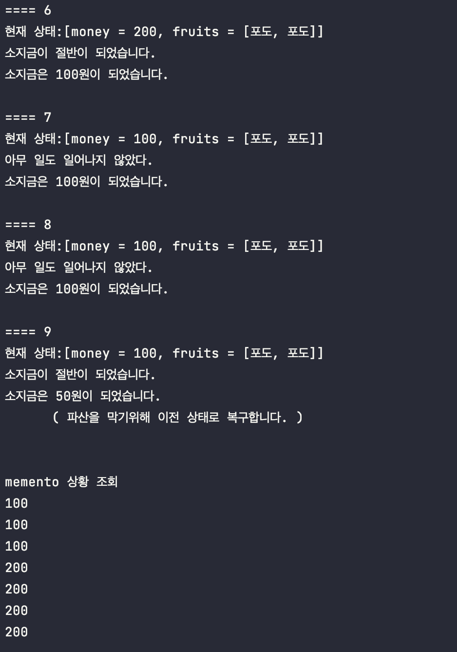- 클라이언트에서 게임이 시작되고, 메멘토보다 money가 작아지면 그 전 상태로 복구, memento보다 돈이 많아지면 memento에 현재 상태를 복사한다.