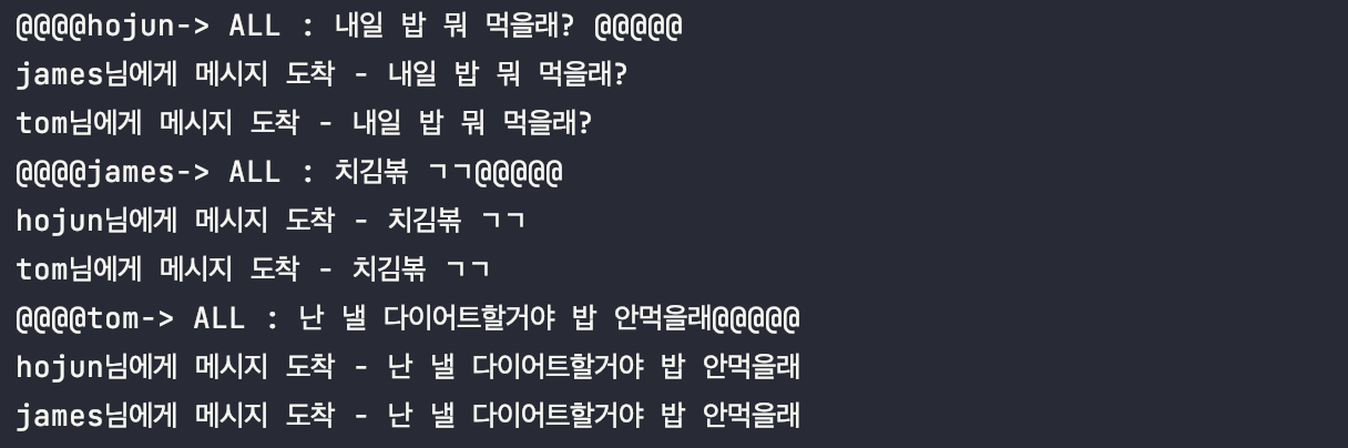 System.out.println("@@@@" + name + "-> ALL : " + msg+ "@@@@@");
