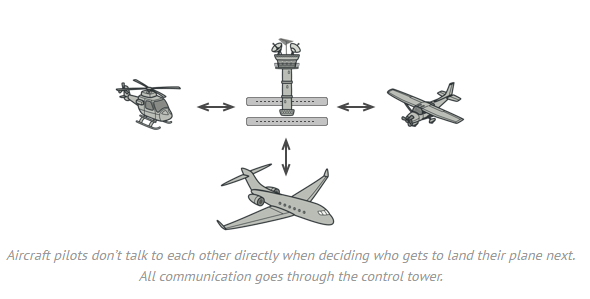 만일 위 그림에서 관제탑이 없다면 각 비행기들은 서로 소통을 해야하지만, 관제탑(중재자)가 이러한 소통의 창구 역할을 해준다.