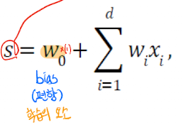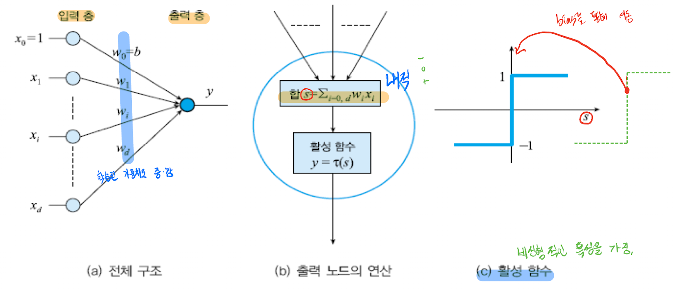 입력층에는 항상 1인 가중치가 들어간다. 왜냐하면 h(x) = wx + b에서 b는 이러한 가중치 역할을 한다. 이 값은 우리가 활성함수를 거칠때 임계점의 역할을 해준다. (c)의 경우 0을 기점으로 -1과 1의 부분이 나뉜것 처럼 말이다.