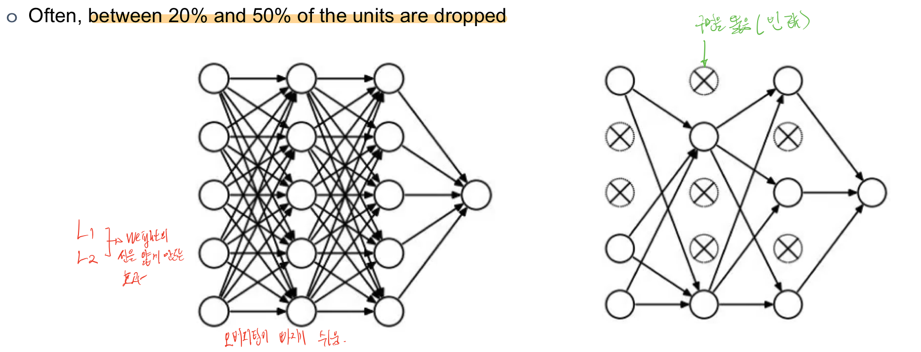 L1놈과 L2놈을 사용해서 정규화를 하는 것은 Weight를 약하게 만드는 효과가 있었다. Dropout은 연결 자체를 끊어버리는 것이다. 랜덤하게 뉴런을 drop시킴으로써 해당 뉴런에 연결되지 않게 하는 것이다.